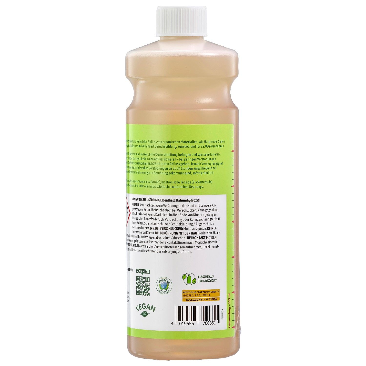 Mit dem Abflussreiniger von Almawin geht das ganz einfach und noch dazu mit einem guten Gewissen, da der Abflussreiniger zu 100% aus natürlichen Inhaltsstoffen besteht und vollständig biologisch abbaubar ist. Zudem ist er ECOCERT zertifiziert und vegan! Die Flasche besteht aus recyceltem Kunststoff.