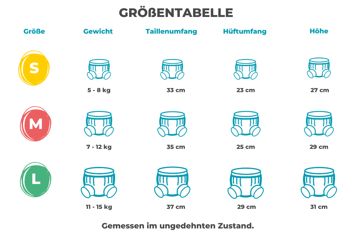 Damit die Schlupfüberhose auch wirklich perfekt sitzt: Wähle eine der drei Größen - entsprechend dem Gewicht deines Babys und seinen tatsächlichen Proportionen (siehe Bild).