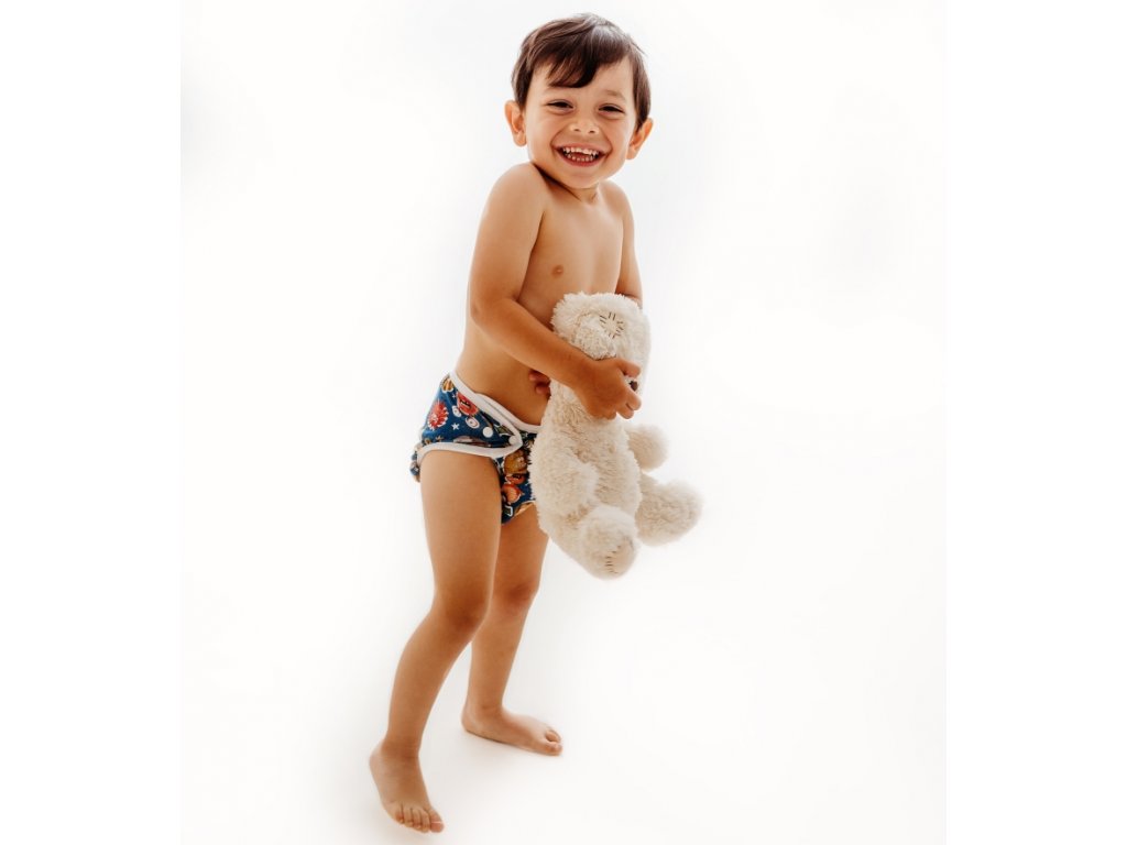 Die XL Höschenwindel von Bamboolik passt Kindern von ca. 15-25kg und hat einen schlanken Sitz, der nicht stark aufträgt. Verschlossen wird die Windel mit Druckknöpfen.