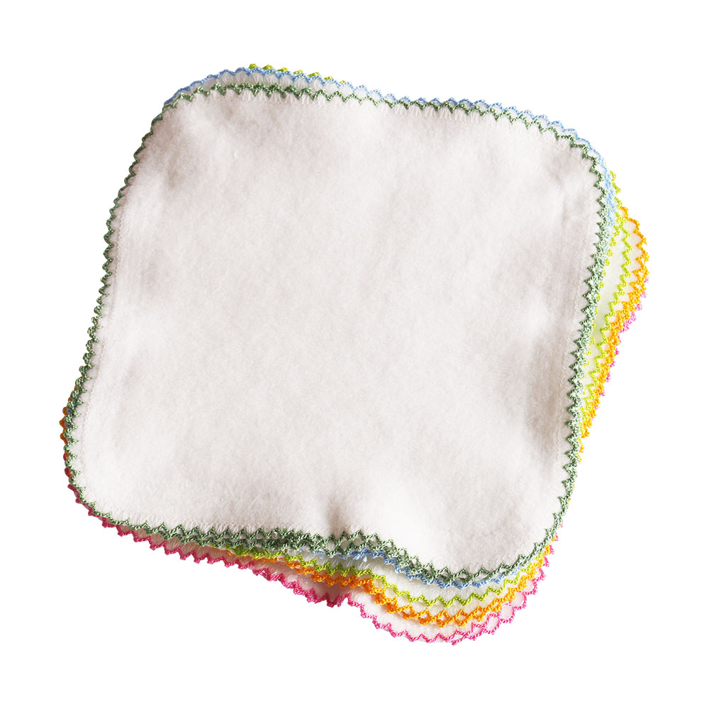 BIO-Baumwoll-Reinigungstücher aus feinem Kuschelstoff mit einer Jersey Seite. Mit buntem Saum eingefasst.