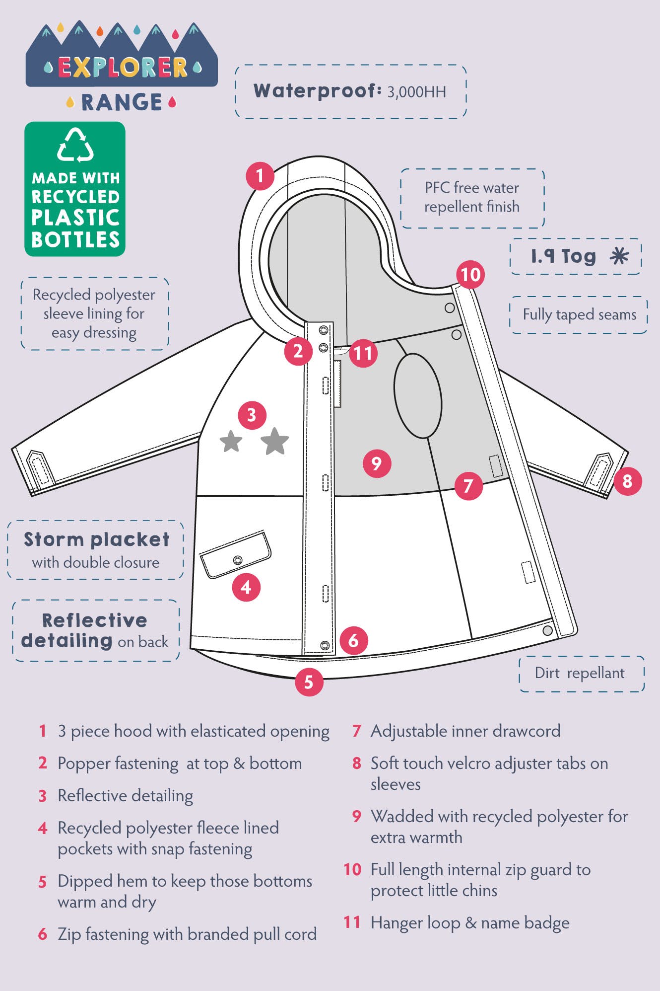Der wasserdichte Explorer-Coat hat eine bequemes, wattiertes Innenfutter und ein superweiches Fleecefutter in der Kapuze.