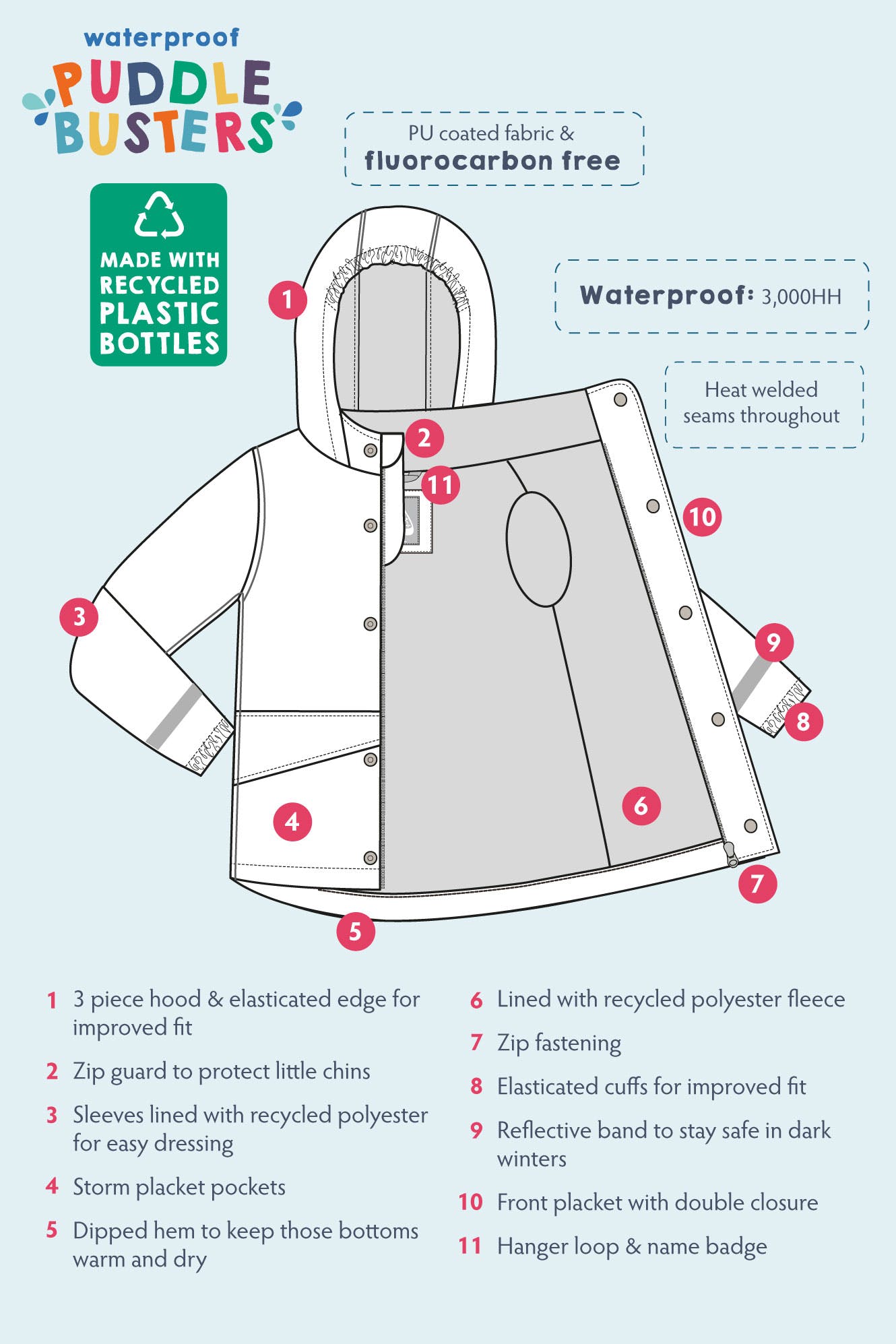 FUN FRUGI FACT: Für die Herstellung eines Puddle Buster Coat, in der Größe von 5-6 Jahren, werden 20 Plastikflaschen benötigt!