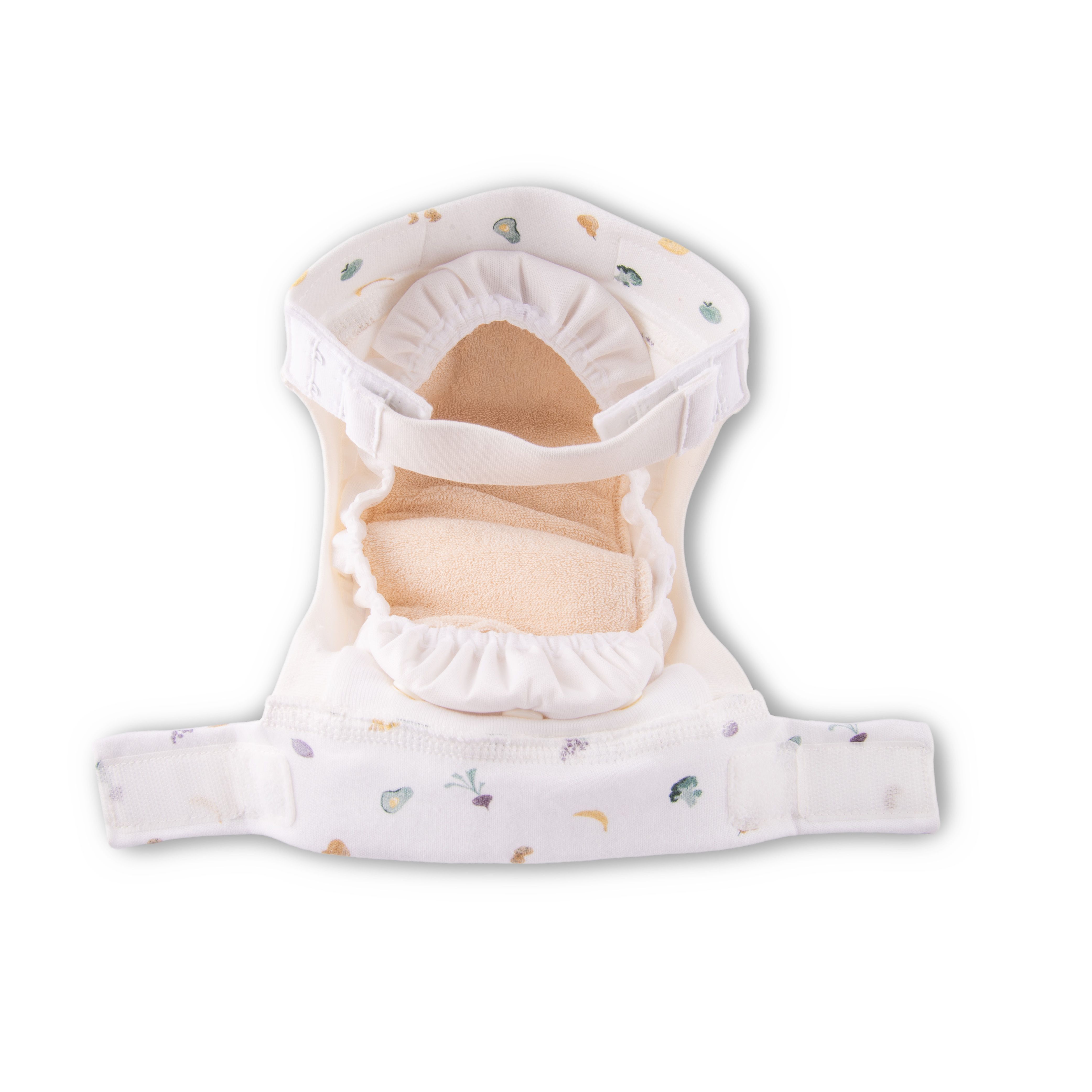 1) Außenwindel: Eine Baumwollüberhose mit Klettverschluss (Klett schließt von vorne nach hinten), gibt der Windel die nötige Stabilität. An den Beinen sind angenehm weiche Beinbündchen. Am Bauchbund ist ein Hakenband für die optionale Windelfrei-Funktion.