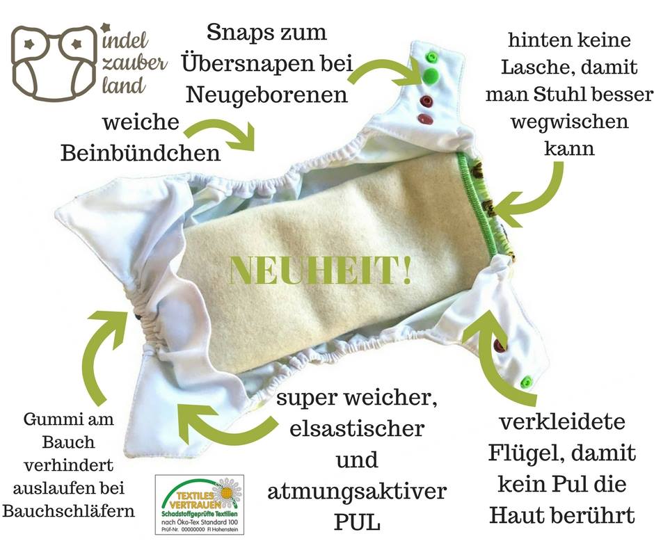 Die Wizly hat innen vorne eine Lasche um Einlagen hineinlegen zu können. Hinten ist keine Lasche, damit man Stuhl besser auswischen kann und die Haut kein TPU berührt. Das leichte Gummibündchen am Bauch verhindert ein Auslaufen auch bei Bauchschläfern.