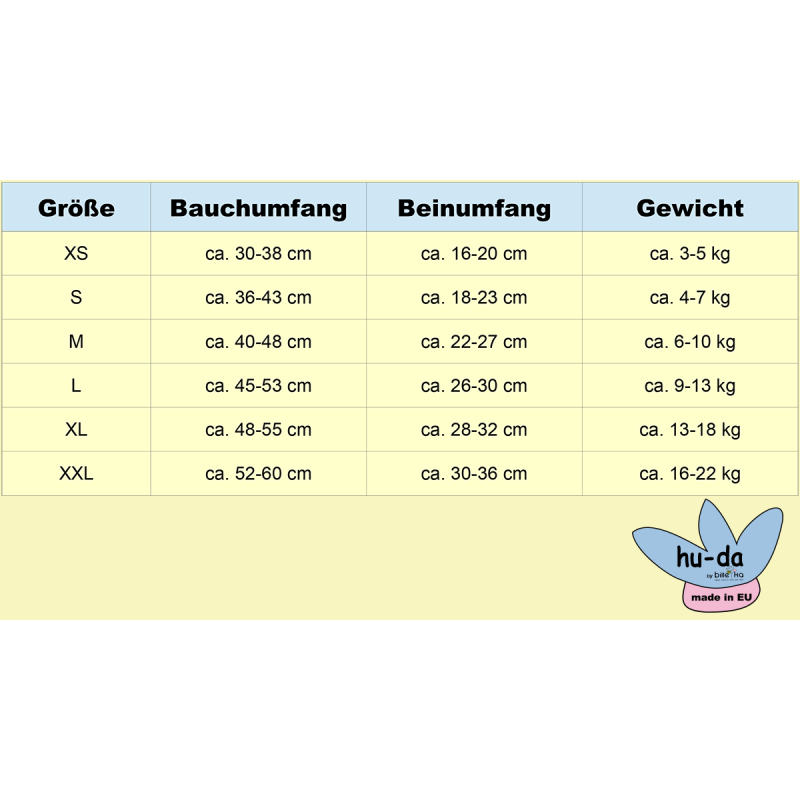 XL: Bauchumfang ca. 48-55cm, Beinumfang ca. 28-32cm, Gewicht ab ca.13kg